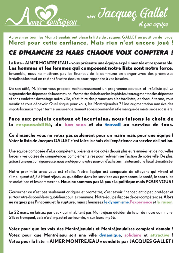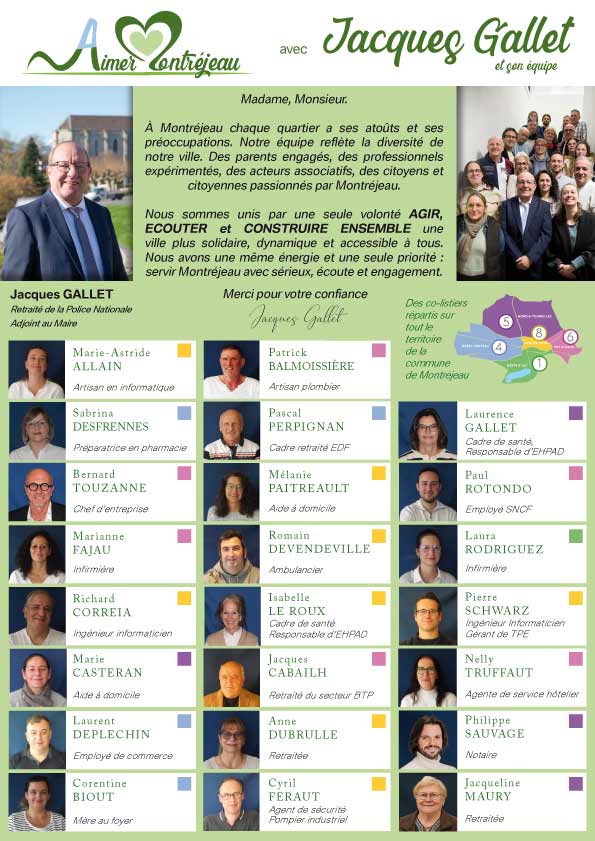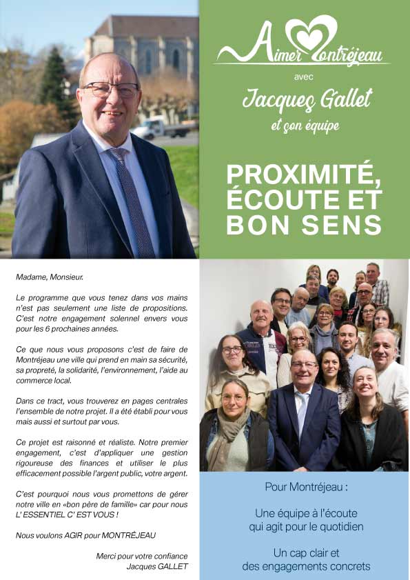 Le 15 mars, les Montréjeaulais ont exprimé majoritairement une volonté de renouveau pour la commune. Nous remercions l'ensemble des électeurs qui nous ont accordé leur confiance dès le premier tour pour porter cette dynamique. Si j'ai choisi de présenter ma candidature, entouré d'une équipe motivée par l'intérêt communal, c'est avec la volonté d'aider et d'agir pour notre ville. C'est le sens même de notre engagement.